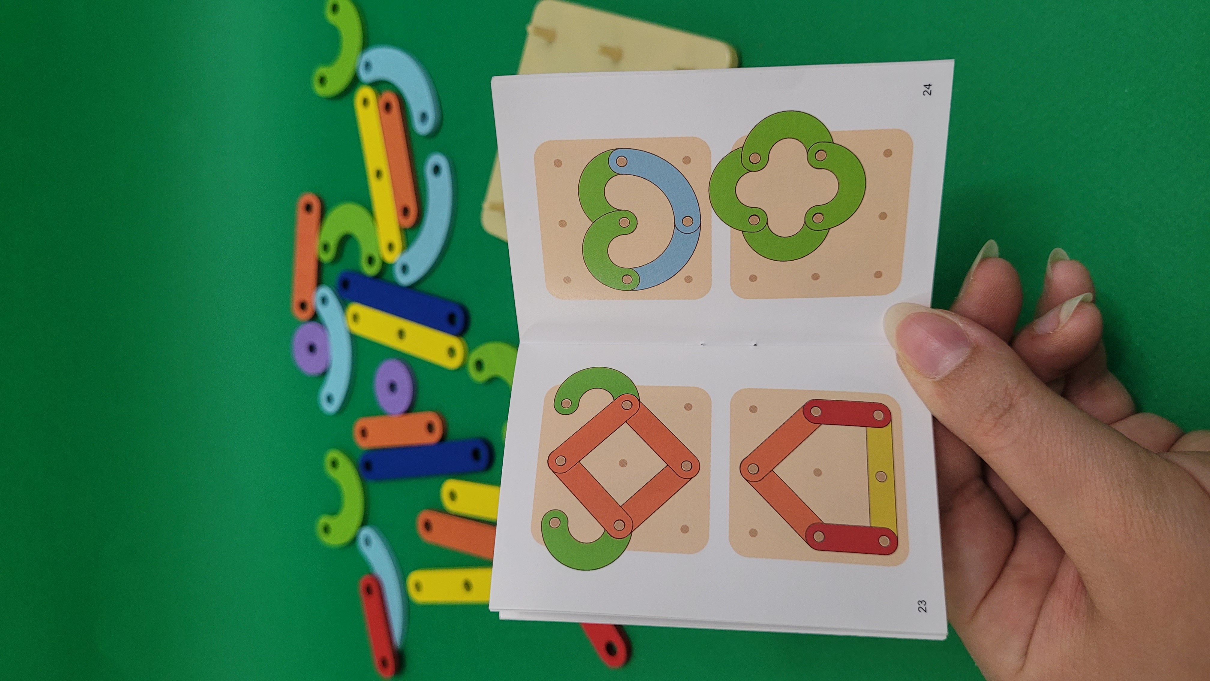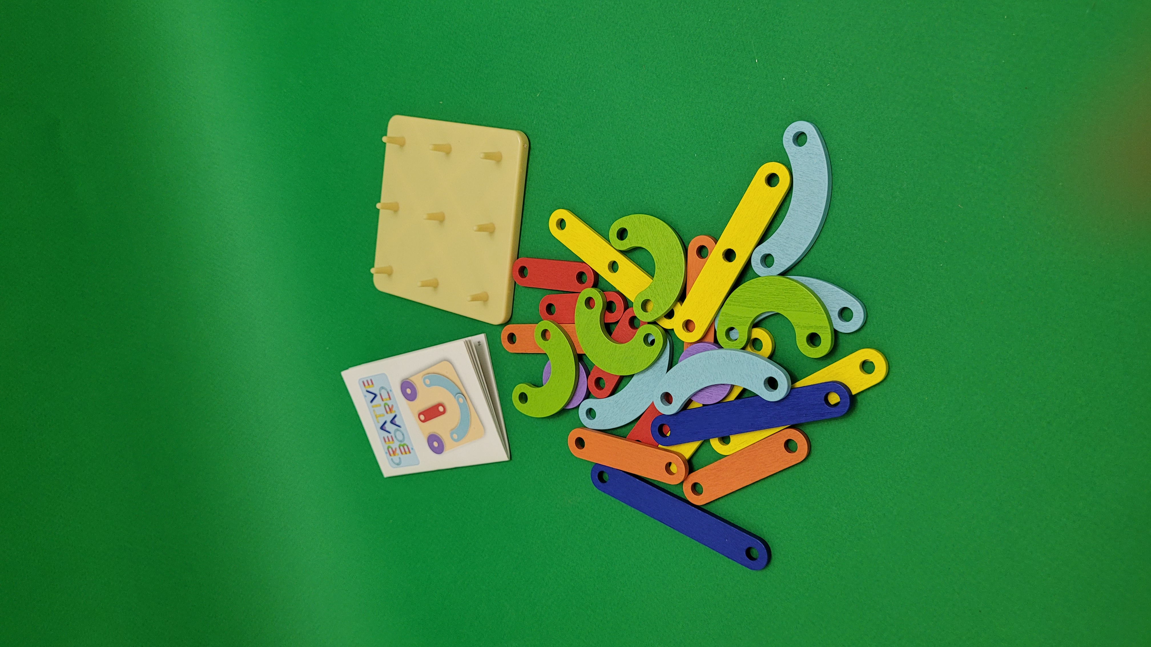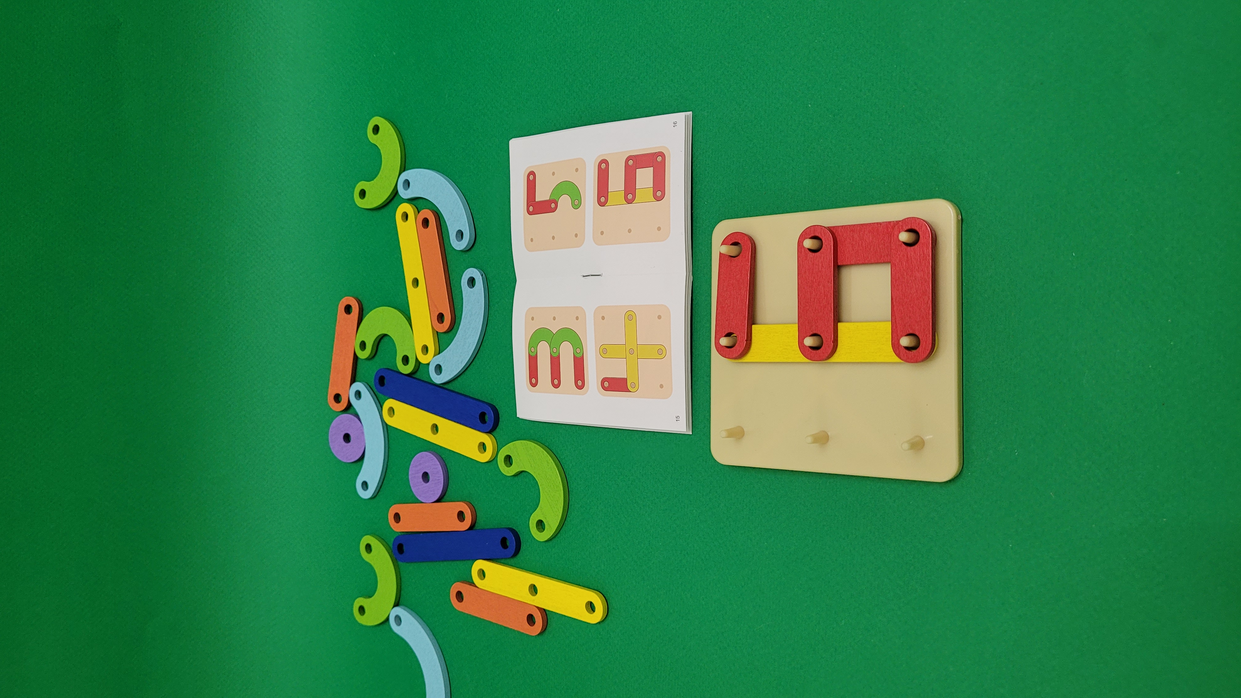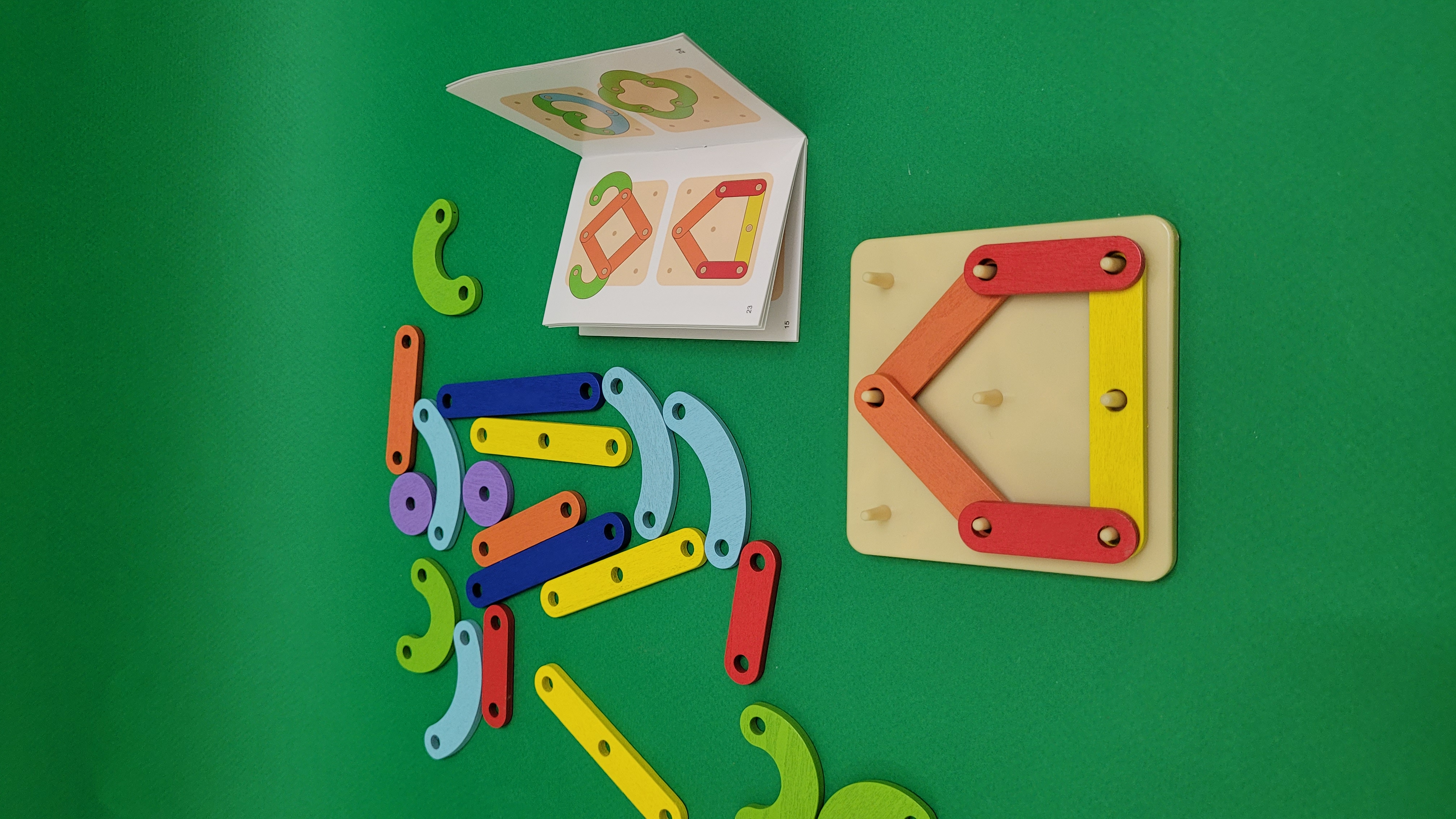 این بازی شامل یک برد مربعی با ابعاد ۱۰ در ۱۰ و ۲۴ قطعه چوبی رنگی با اشکال متفاوت و یک دفترچه شامل الگوهای مختلف هستش /برای کودکان ۳سال به بالا منابه چون قطعات ریز داره