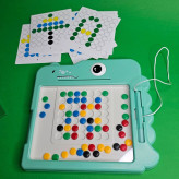 ابن اسباب بازی برای افزایش تمرکز و دقت بچه ها بسیار مفیده . هماهنگی چشم و دست بچه هارو تقویت میکنه. ی قلم داره ک توسط اون بچه ها مهره هارو جابجا میکنن . 10تا کارت الگوی پشت و رو داره ک بچه ها میتونن طبق اون رنگ هارو بچینن. این بازی مناسب سن 2سال ب بالا هستش
